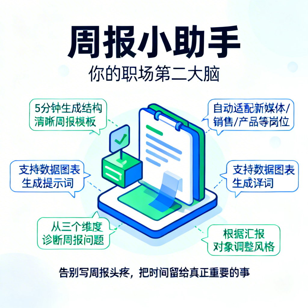 周报小助手,你的职场第二大脑。只需告知行业和零散工作内容,5分钟生成结构清晰的周报模板。自动适配新媒体、销售、产品等岗位,支持数据图表生成提示词,从三个维度诊断周报问题,根据汇报对象调整风格。让周报从流水账升级为高价值工作汇报。告别写周报头疼,把时间留给真正重要的事。